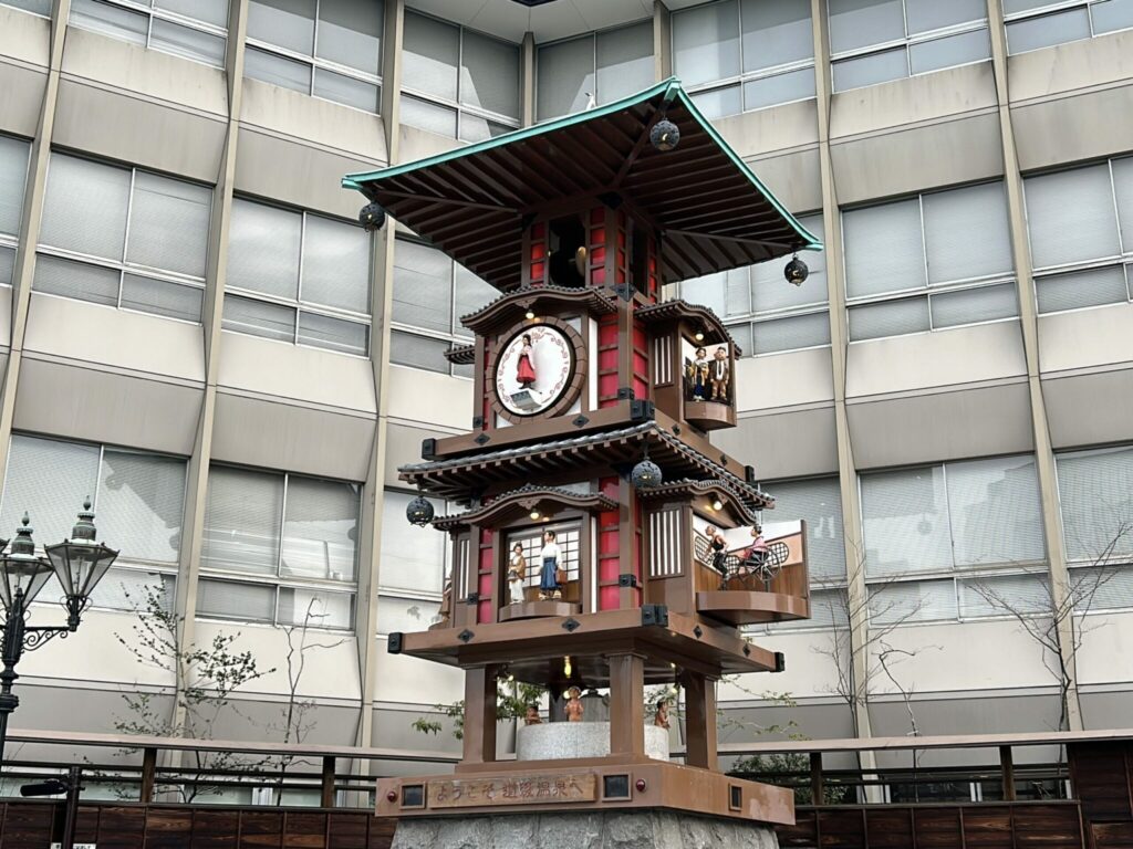 背对道后温泉站,映入眼帘的便是「少爷机关钟」。