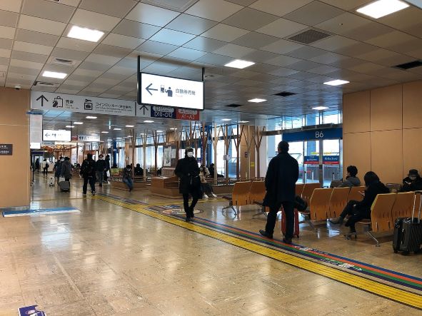我在宽敞的休息室内等候直至巴士到达。大楼内还有卫生间, 便利商店及自动贩卖机等设施可以使用。于巴士到站时更有广播通知, 即使在寒冷的天气下仍可在休息室等候至发车前一刻才登车。