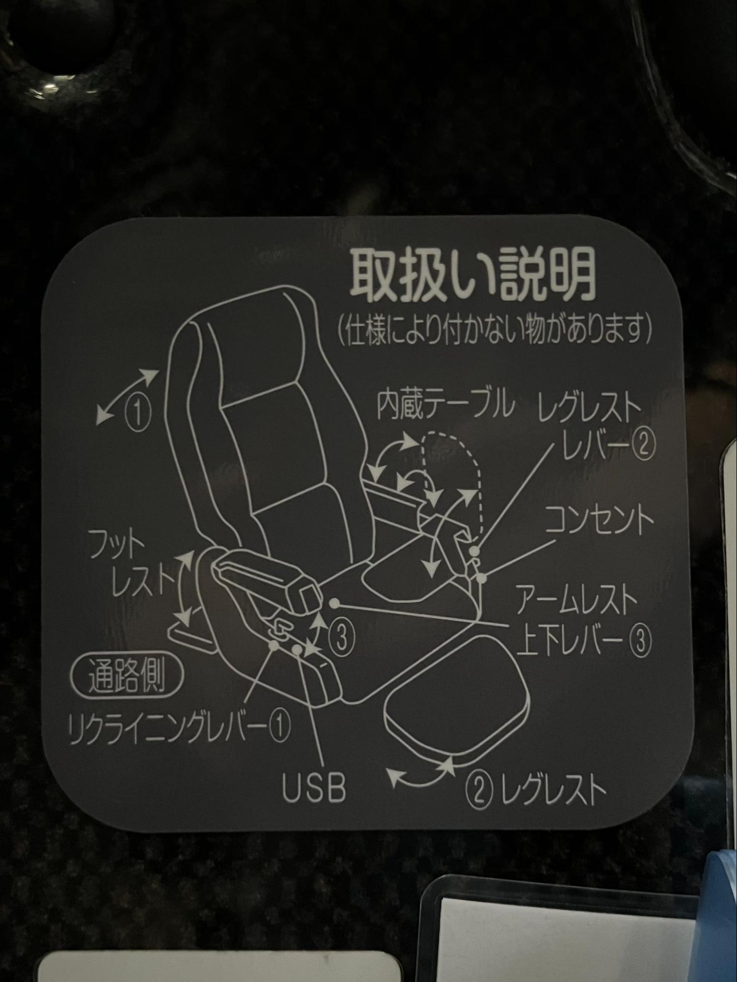 座位如照片所示,配備了與其他座位以及窗戶遮起來的簾布,桌子以及放腿放腳板,即使是長時間的乘車也不會讓我感到疲憊。還有椅子能夠大角度的調節能讓我在回程的路上以舒服的姿勢緩解當天的疲勞。除此之外也配備了一個USB和兩孔的插頭以便使用電子設備。